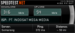 Saat ini aku memakai Nokia N77 sebagai modem dan rata-rata sinyal yang didapat adalah tiga bar. Sinyal yang kudapat memang kurang stabil, terkadang 4 bar – 1 bar sehingga kecepatan yang kudapat untuk setiap kali online cukup bervariatif. Oh iya, untuk sekedar informasi tambahan aku tinggal di wilayah depok timur dan aku beli paket perdana IM2 di OkeShop MargoCity Depok dengan harga Rp150.000.